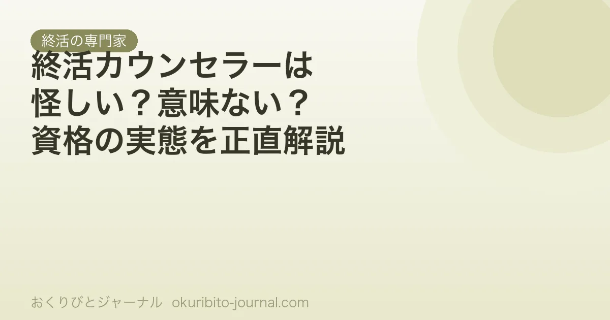 終活カウンセラーが「怪しい」と言われる理由(民間資格・合格率98%・年会費)を正直に解説。終活カウンセラー協会の実態・終活アドバイザーとの違い・信頼できる相談先の見分け方をまとめました。 相続・手続き