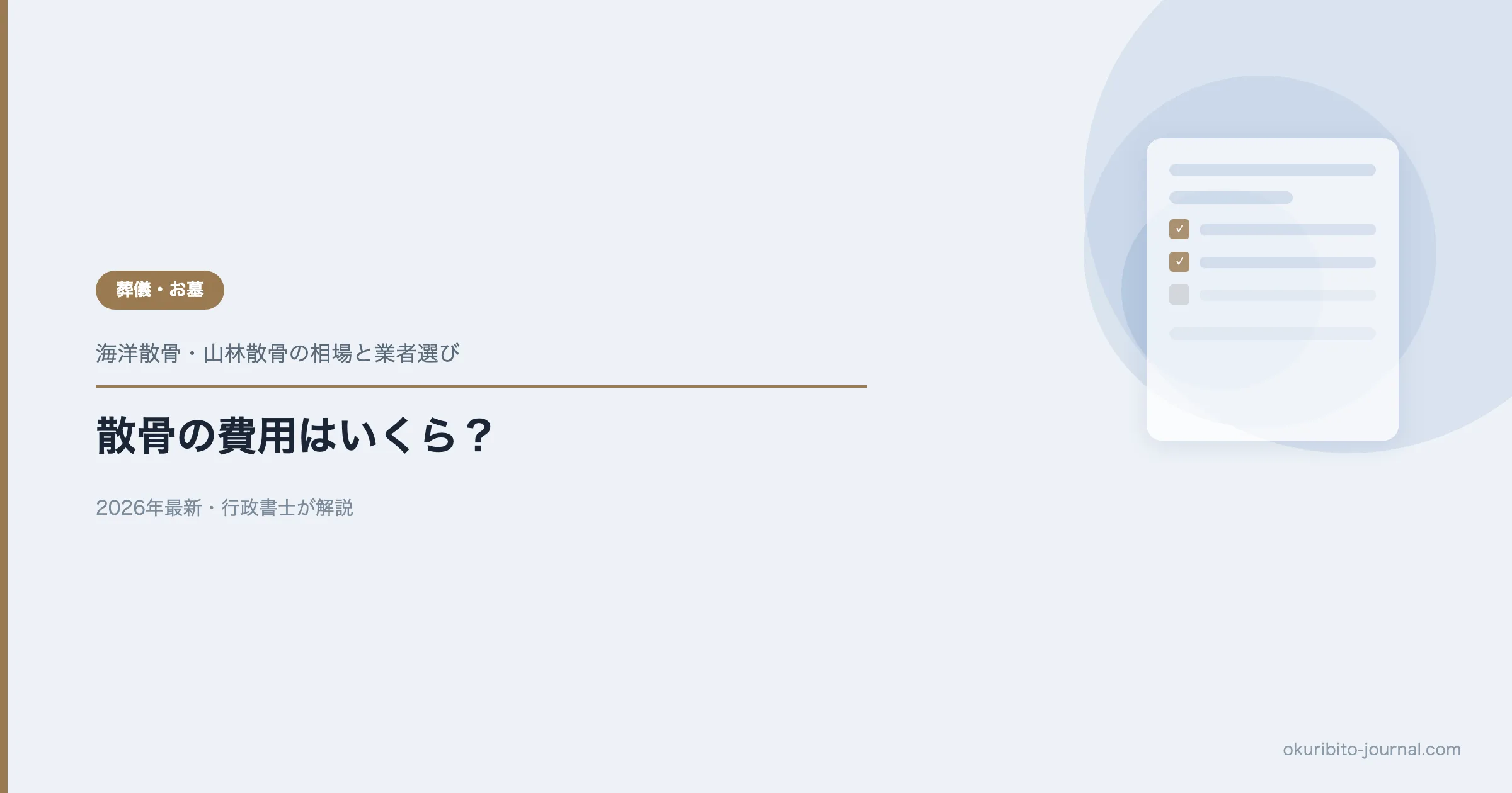 免責事項:本記事は一般的な情報提供を目的としており、個別の法的・行政的助言を行うものではありません。散骨の実施にあたっては、弁護士・行政書士・各自治体等の専門家にご相談ください。掲載情報は2026年3月時点のものであり、法改正等により変更となる場合があります。