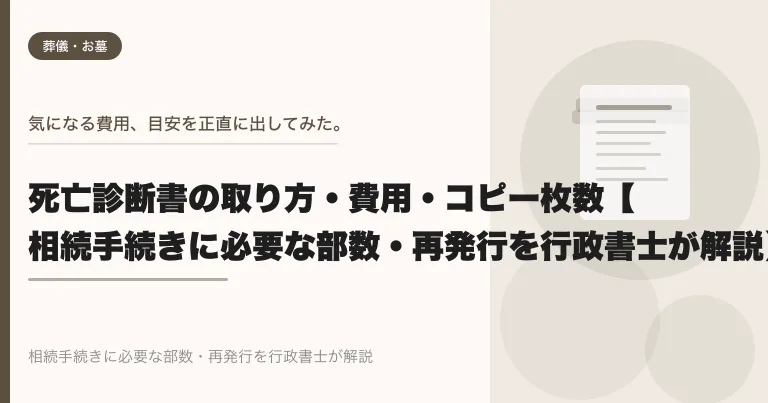 本記事では、死亡診断書の取得方法・発行費用・必要なコピー枚数を、相続手続きに使う場面とあわせて解説します。葬儀社が代行してくれることも多いですが、ご自身でも内容を把握しておくと、いざというときに慌てずに済みます。